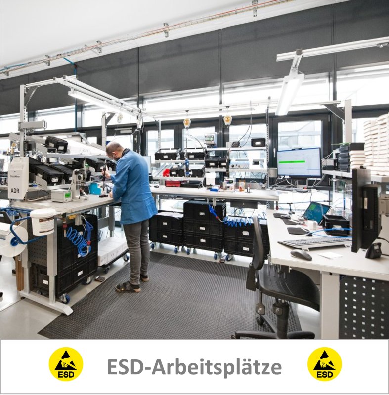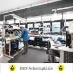 ESD geschützte Arbeitsplätze von ERGO-line, leiten die vorhandenen Ladungen kontrolliert zur Erde ab.