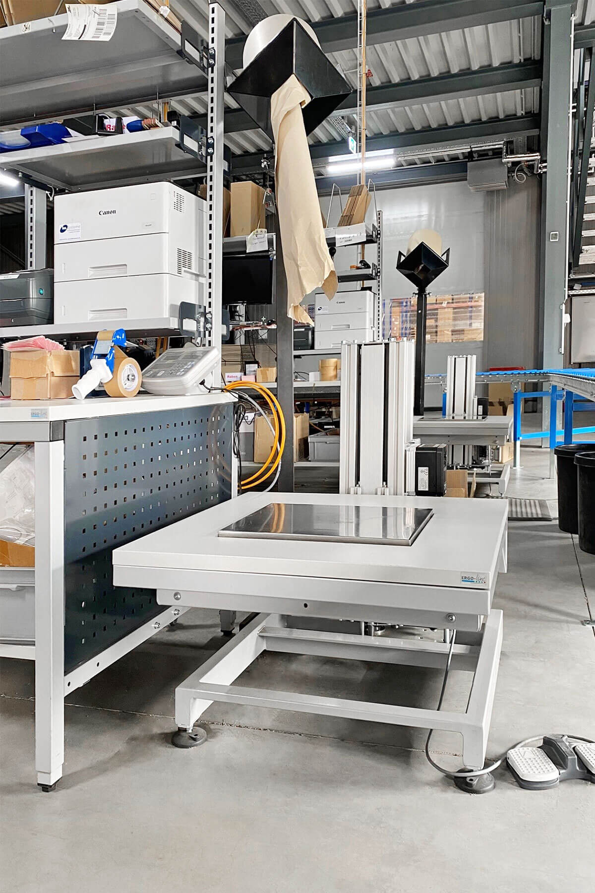 Zum Einsatz kam der ERGO-Basic, ergänzt durch ein elektrisches Hubelement. Dadurch konnten zwei ergonomische Packstationen realisiert werden, die Flexibilität, Komfort und Effizienz in den Arbeitsalltag bringen.