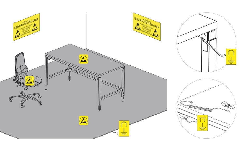 Mit unseren ESD-geschützten Arbeitsplatzsystemen minimieren Sie das Risiko elektrostatischer Entladungen, die empfindliche Elektronik beschädigen können. Unser ESD-Schutz sorgt nicht nur für mehr Sicherheit und Stabilität in Ihrer Produktion, sondern steigert auch die Produktqualität und Langlebigkeit Ihrer Systeme. Diese Schutzmaßnahmen lassen sich flexibel in Ihre Arbeitsabläufe integrieren, sodass Ihre Mitarbeiter und Produkte bestmöglich geschützt sind.
